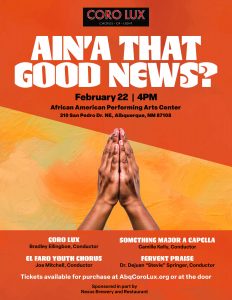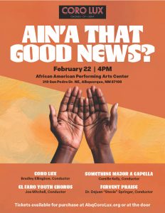 With profound respect, Coro Lux acknowledges that the city of Albuquerque where we sing is the traditional homeland of the Tiwa-speaking pueblos, and that the larger state of New Mexico is the ancestral homelands of the indigenous members of the Pueblos, Apache, and Navajo (Dine), and is the adopted homeland of many other indigenous tribal members who have made New Mexico their home. Coro Lux sings for a better world, and we honor the land on which we sing and those who lived here before us.
